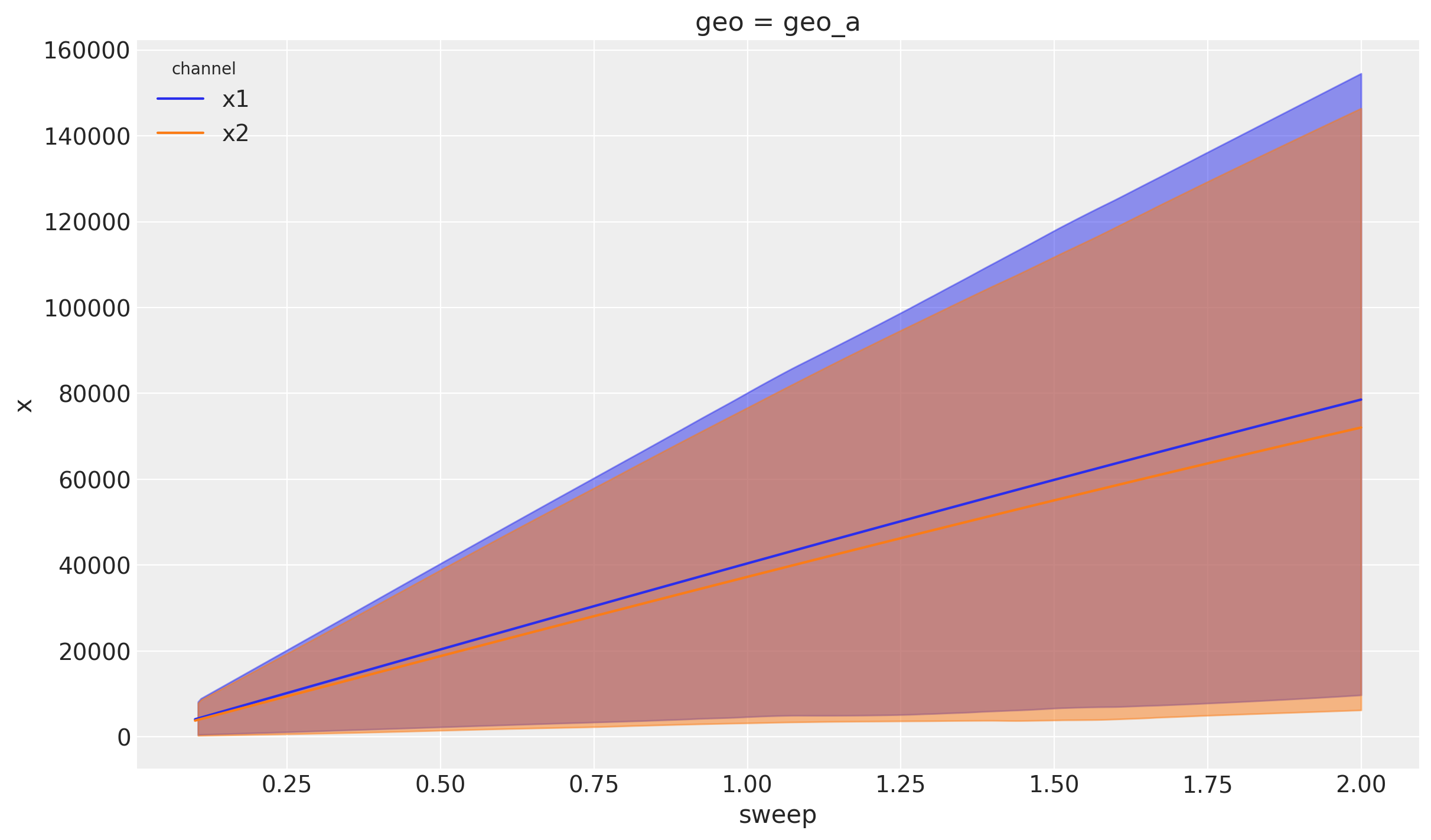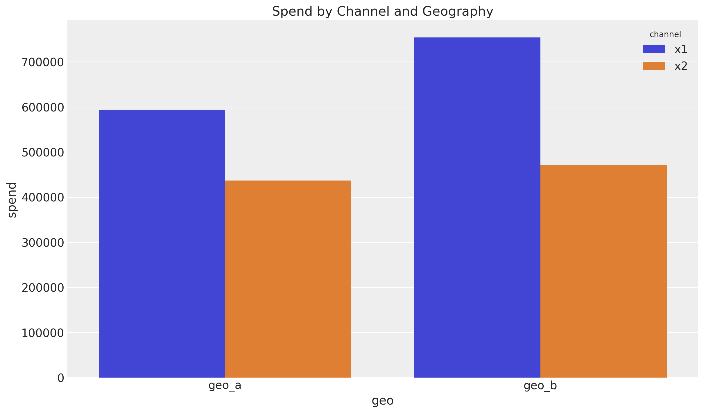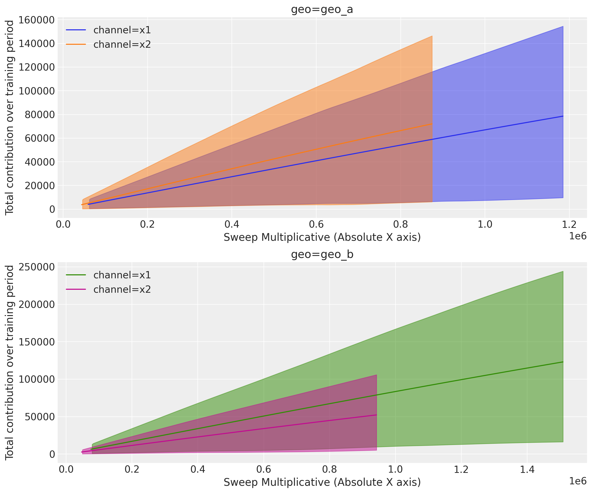 For Geo A, we see that the contribution of \(x_1\) and \(x_2\) are comparable whereas for Geo B, \(x_1\) has a much higher contribution than \(x_2\).